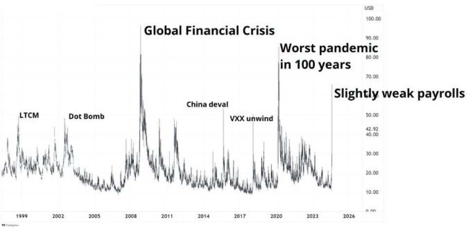 Taking the philosophical and applying it to the practical we can see a version of this playing out in recent market action. By trying to generate alpha by efficiently harvesting uncorrelated risk premia we have ended up creating a fragile market structure. Risk has to go somewhere; if everyone seeks to maximize their Sharpe ratio, there needs to be winners and losers for the game to remain zero-sum. The recent trend has been long the dollar, long tech stocks (growth), short small caps (value), and long alternative assets. As more money flows into those asset classes and strategies it lowers their expected return just like everyone betting on Kansas City to win the Super Bowl moves the betting line. As the competition in those asset classes increases investors pursue more granular and complex strategies that are inherently fragile due to their complexity. This dynamic gets exaggerated by the investment product marketing function which amplifies flows into popular asset classes and strategies that have "worked" recently. In The Third Law we wrote about how the flows from the dispersion trade were causing the market to entice you to bet on change which was the market's way of offlaying the risk from the dominant flows. Last week the chart below was being passed around which poked fun at the 65 VIX event we experienced on Monday morning. What we should see in this chart is not an over reaction to a payroll miss but the effect of a crowded trade being unwound (long tech - short small cap) which was identified well in advance of the 65 VIX event. The market was giving us good odds for something like this to happen so we shouldn't have been surprised when it happened.