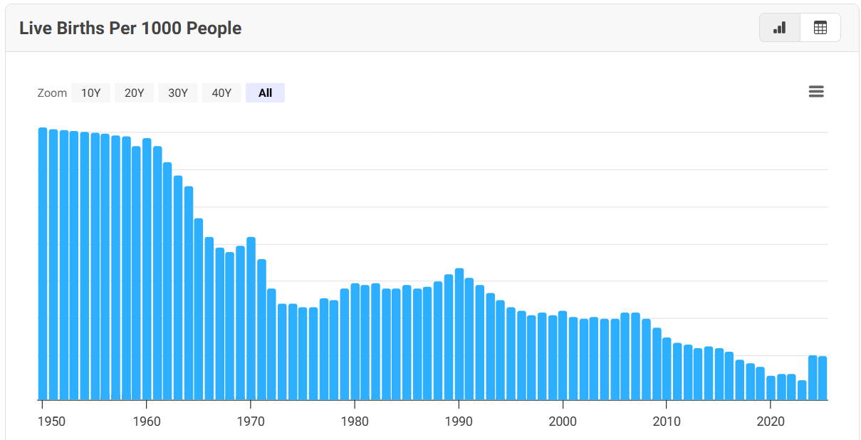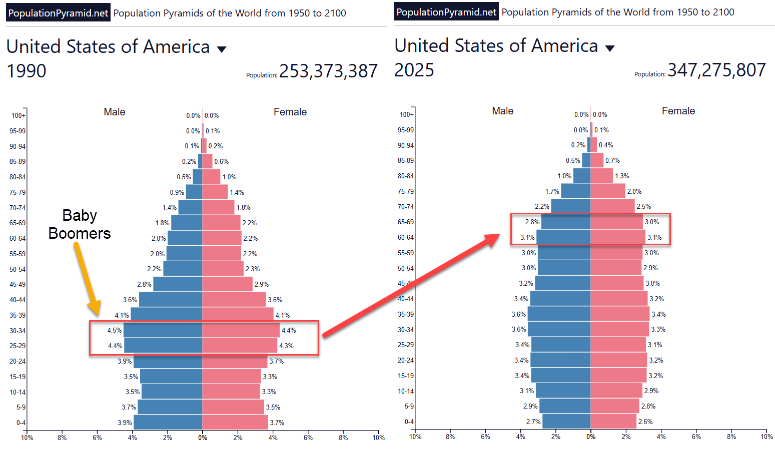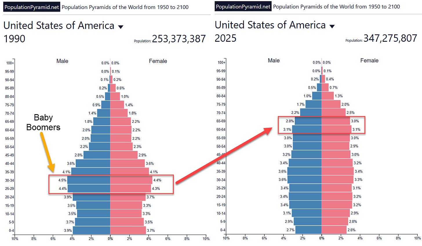 The combination of the aging of the baby boomers and lower birth rates has led to an aging US population which present all sorts of economic headwinds.