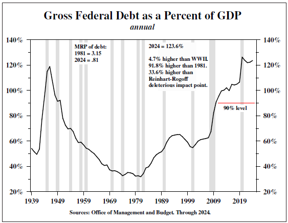 Economic output declines when a factor of production (land, labor, capital technology) is overused. Confirming this situation, the U.S. has experienced a decline in the dollar amount of GDP produced by a new dollar of government debt. In 2024, a new dollar had only 80 cents of GDP, down from about $3.15 in 1981, thus dramatically illustrating diminishing returns.
