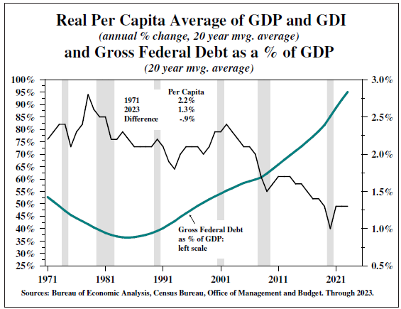 This effect can be seen clearly in the chart below which contrasts the long-term moving average of economic growth with federal debt.