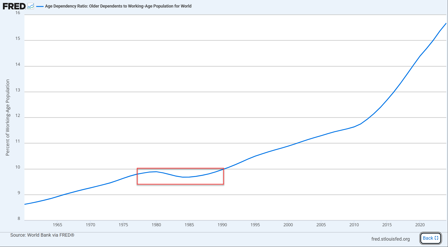 Beginning around 1990, the US’s age dependency ratio line started moving higher and has recently increased upside velocity. Given that increase we should expect to see lower labor force participation and lower productivity.