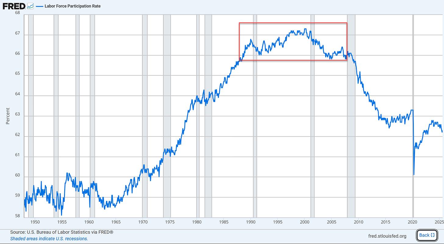 All else being equal, the aging of America since 1990 should have caused productivity to decline and inflation to rise; but it did not. We are well aware of the impact of technology, and most recently AI’s impact on productivity, but what other forces could be at work? We must ask this because we have experienced a change in inflation recently while productivity growth remains healthy with prospects to accelerate, so what else might be at work that has caused inflation to rise?